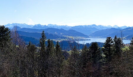 Ausblick vom Etzel auf den Sihlsee und die Alpen